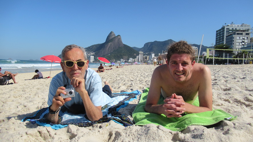 Foto: José Herrera Plaza (à esquerda) com Jaime García Parra em 2022 na praia de Ipanema – como parte da programação paralela do International Uranium Film Festival do Rio.